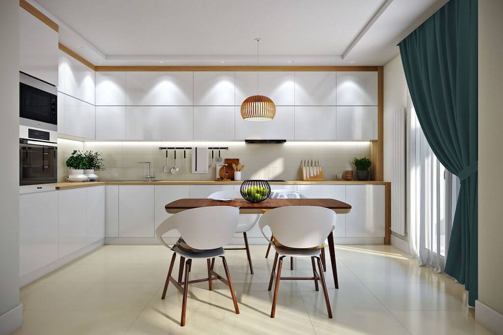 Уютным трендом 2019 года считается расположение главной люстры не в центре комнаты, а ровно над обеденным столом — так получается более мягкое свечение. Еще одним модным решением стало использование на кухне светодиодной ленты по периметру или только под навесными шкафами — это экономичное решение, которое очень эффектно смотрится.