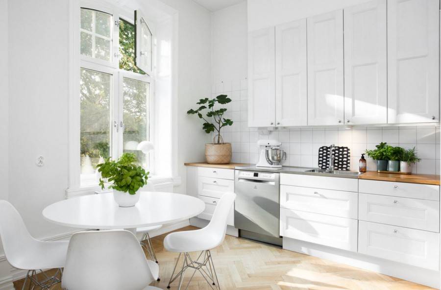 Белая кухня в скандинавском стиле выглядит уютной за счет разбавления доминирующего цвета яркими аксессуарами: посудой на открытых полках, цветов в горшках на подоконнике, столе и в рабочей зоне, деревянной столешницей.