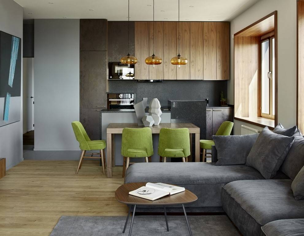 Но можно поступить и наоборот – совмещенную с гостиной кухню застелить одним материалом. Например, ламинатом, паркетной доской (из плотной и влагостойкой породы дерева), либо той же плиткой, но одного цвета. Такой прием поможет зрительно увеличить площадь.