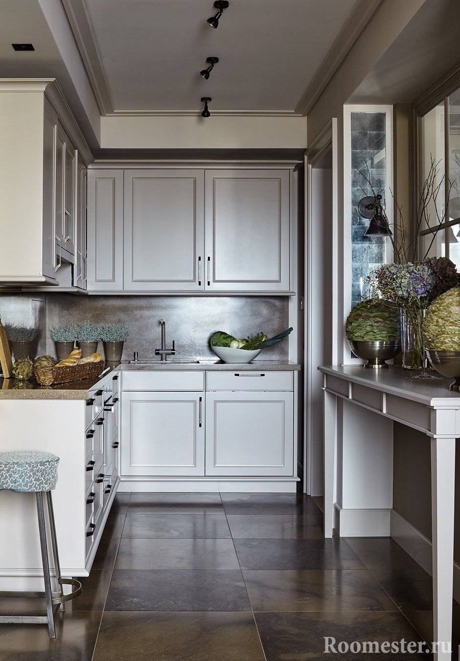 3. Чтобы кухня казалась выше, пол делают на 2 – 3 тона темнее, чем стены. От ламината и деревянной доски в данном случае лучше отказаться в пользу практичного линолеума, плитки или керамогранита.