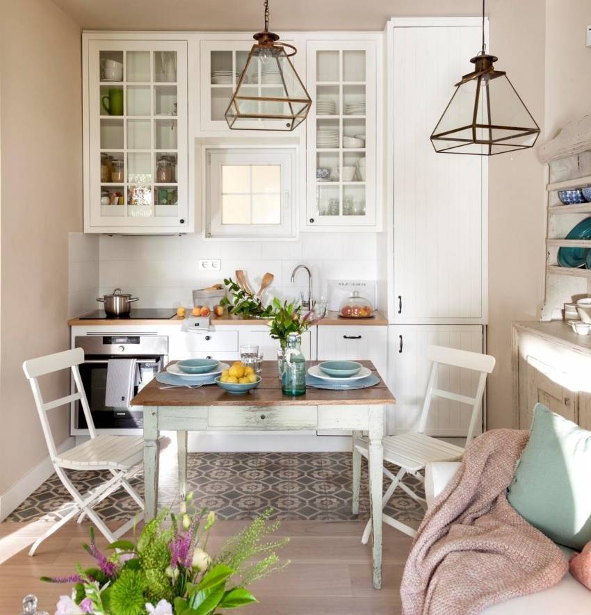Для этого рекомендуется выбирать мебель с более «нарядными» фасадами, материалы, имитирующие натуральные поверхности, выставлять на первый план классические сервизы и качественный текстиль с узорами. На кухне обязательно должен присутствовать небольшой стол со стульями в качестве обеденной зоны.