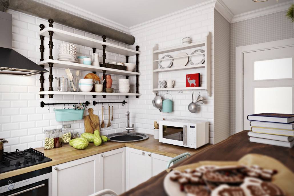 Прованс. Милый светлый интерьер в духе французской деревеньки отлично подойдёт для маленькой кухни. Гарнитур лучше всего выбрать в бежевых тонах. Бытовая техника пусть будет чисто белой. На окно повесьте светлые занавески с набивным цветочным принтом. В качестве украшения при наличии открытых полок расставьте на них глиняные горшочки со специями. Можете повесить картину с деревенским пейзажем, с букетом цветов. В узкую вазу на обеденном столе поместите пучок колосьев, лаванды.
