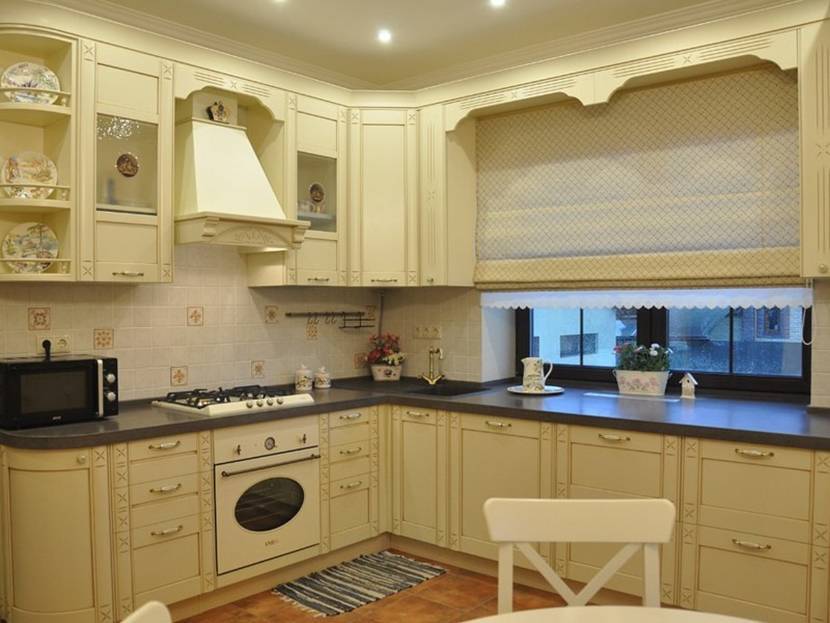 Шторы, настенные декоративные элементы, салфетки и полотенца подбирают в такой же цветовой гамме или наоборот создают с их помощью яркие контрастные акценты. Занавески – короткие, драпировка и ламбрекены исключаются.
