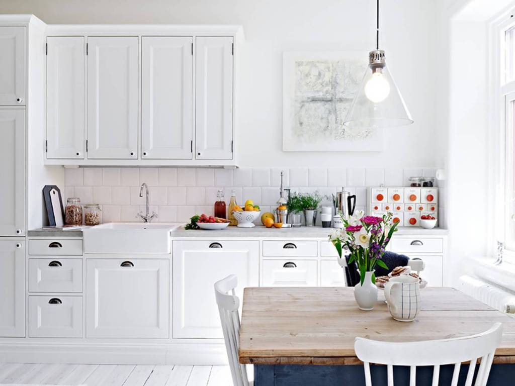 - Следует расширять пространство визуально. Поэтому отказываются от темных расцветок, отдают предпочтение светлым пастельным тонам. Лучше выбрать белый цвет – он отлично увеличит визуально 5-6 метров, которые встречаются в прежних «сталинках» и «хрущевках». Белый кухонный гарнитур не практичен, поэтому лучше сделать белыми стены и потолок, светло-серым или песочным пол. Немного солнца в белой кухне внесут яркие текстильные предметы – полотенце, салфетки, занавески.