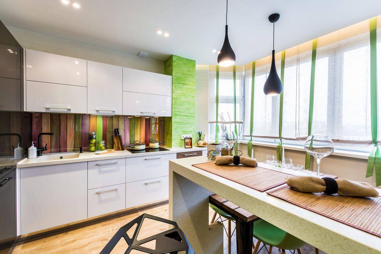 Вынести часть кухни на застекленный балкон или лоджию, что дополнительно дает 1,5-2 кв. м. При этом перегородка превращается в барную стойку, иногда – во французское окно. Балкон следует утеплить.