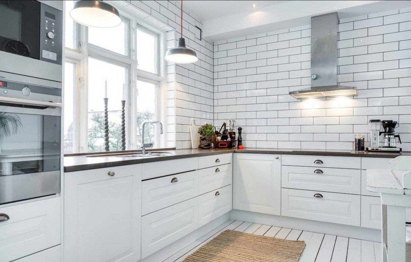 панели из дерева, сочетающиеся по цвету с гарнитуром, но контрастирующие с фартуком, сделают скандинавскую кухню очень стильной и привлекающей внимание;