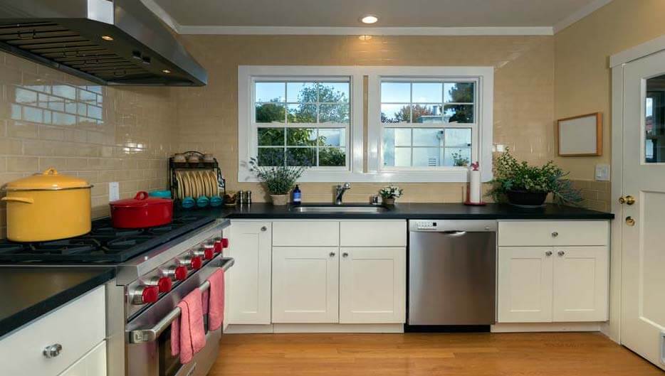 Беспроигрышный вариант дизайна, который задействует сразу две стены и угол, тем самым освобождая место для столовой зоны. Такую кухню с большим окном можно оформить в бежево-карамельных тонах. Фартук выложить в виде мозаичного панно, а столешницу выполнить из бежевого мрамора. Акцентную стену отлично украсят фотообои.