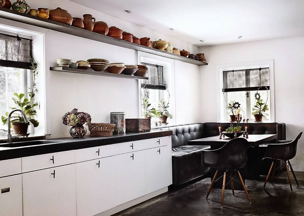 Будет кухня белая, черная, зеленая или желтая, вопрос пока что вторичный. Для начала стоит подумать, как именно реализовать систему хранения. Ведь от шкафов мы отказываемся. А места для хранения разной кухонной утвари все равно нужны.