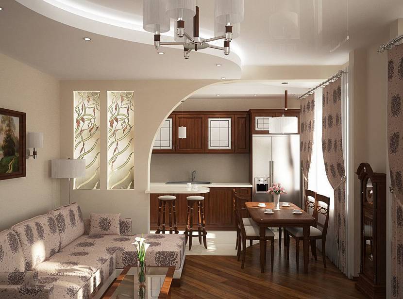 Особой роскошью и обилием позолоченных элементов обладает классическое направление. Кухню-гостиную оформляют в пастельной оттеночной гамме. Для стен применяют штукатурку или дорогие обои с неброскими узорами, потолок украшают лепниной и дополняют шикарной люстрой. В качестве зонирующих элементов уместно использование колонн или ажурных арок. Классика характеризуется дорогими мебельными конструкциями, сделанными из древесины и натуральной обивкой в комбинации с богатым оформлением оконных проемов.