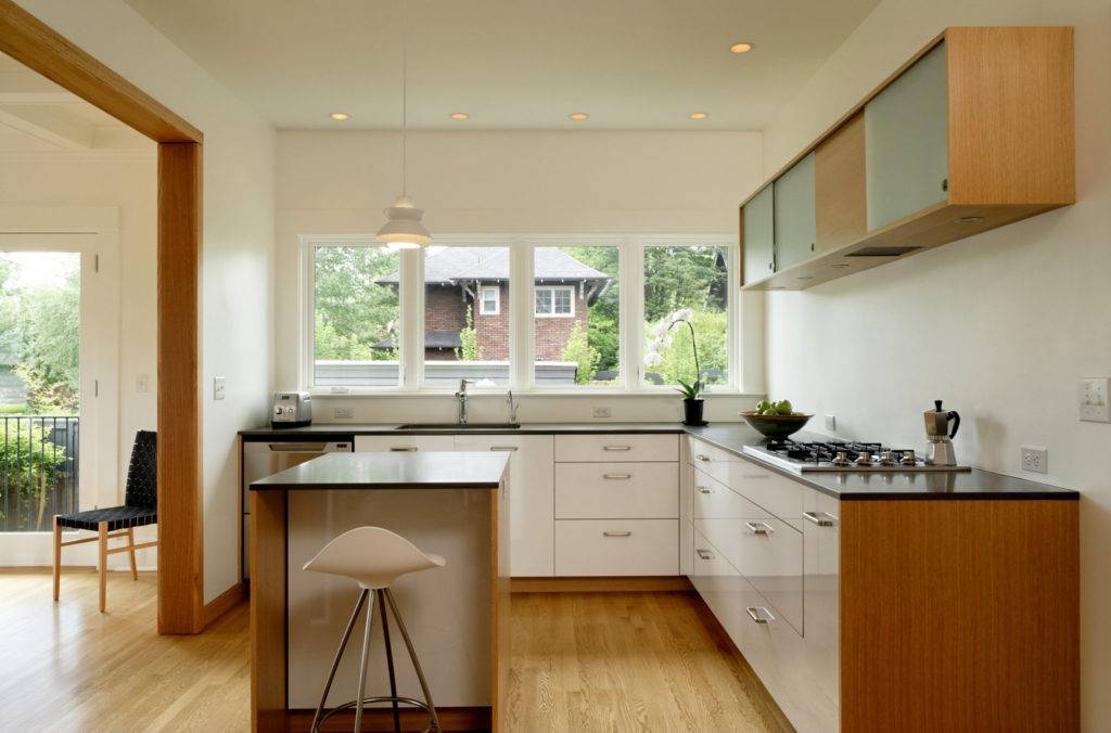 - Устанавливать кухонный гарнитур п-образной формой. Такой формат только загромоздит пространство и будет препятствовать свободному передвижению. Для открытого пространства подойдет установка мебели и техники либо в линию, либо в г-образную форму.