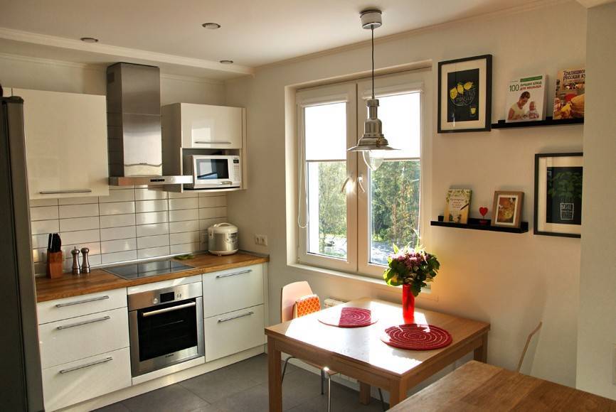 Кухонная мебель обычно устанавливается одной линией или в форме буквы «Г». Так можно сэкономить пространство. Не рекомендуется загромождать комнату крупногабаритным кухонным гарнитуром. Для рационального расположения пространства лучше выбрать кухонные подвесные ящики высотой почти до потолка, чтобы туда поместилось как можно больше посуды.
