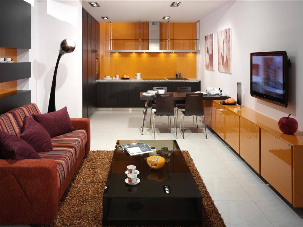 Оранжевая облицовка освежит кухню-гостиную.