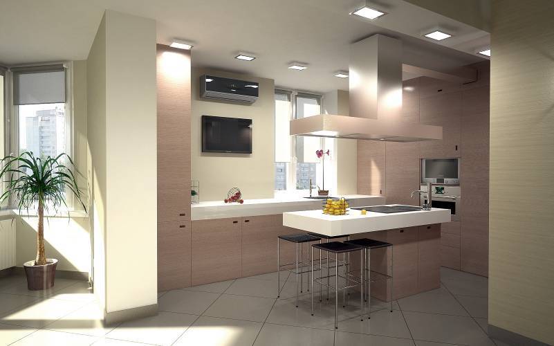 - Устанавливать один центральный источник света. Каждая зона должна быть индивидуально подсвечена несколькими источниками света и желательно, чтобы яркость света была регулируемой. Практичный вариант для каждой зоны – центральный светильник/люстра сверху и точечные над всеми функциональными зонами, где будет что-то делать человек.