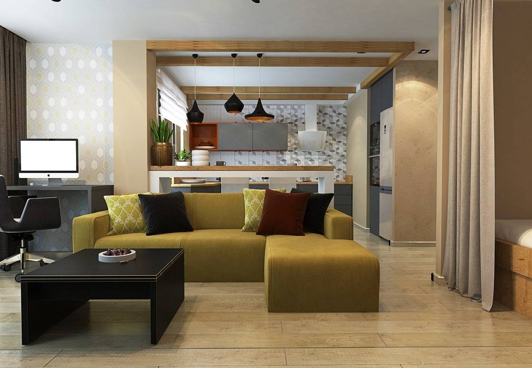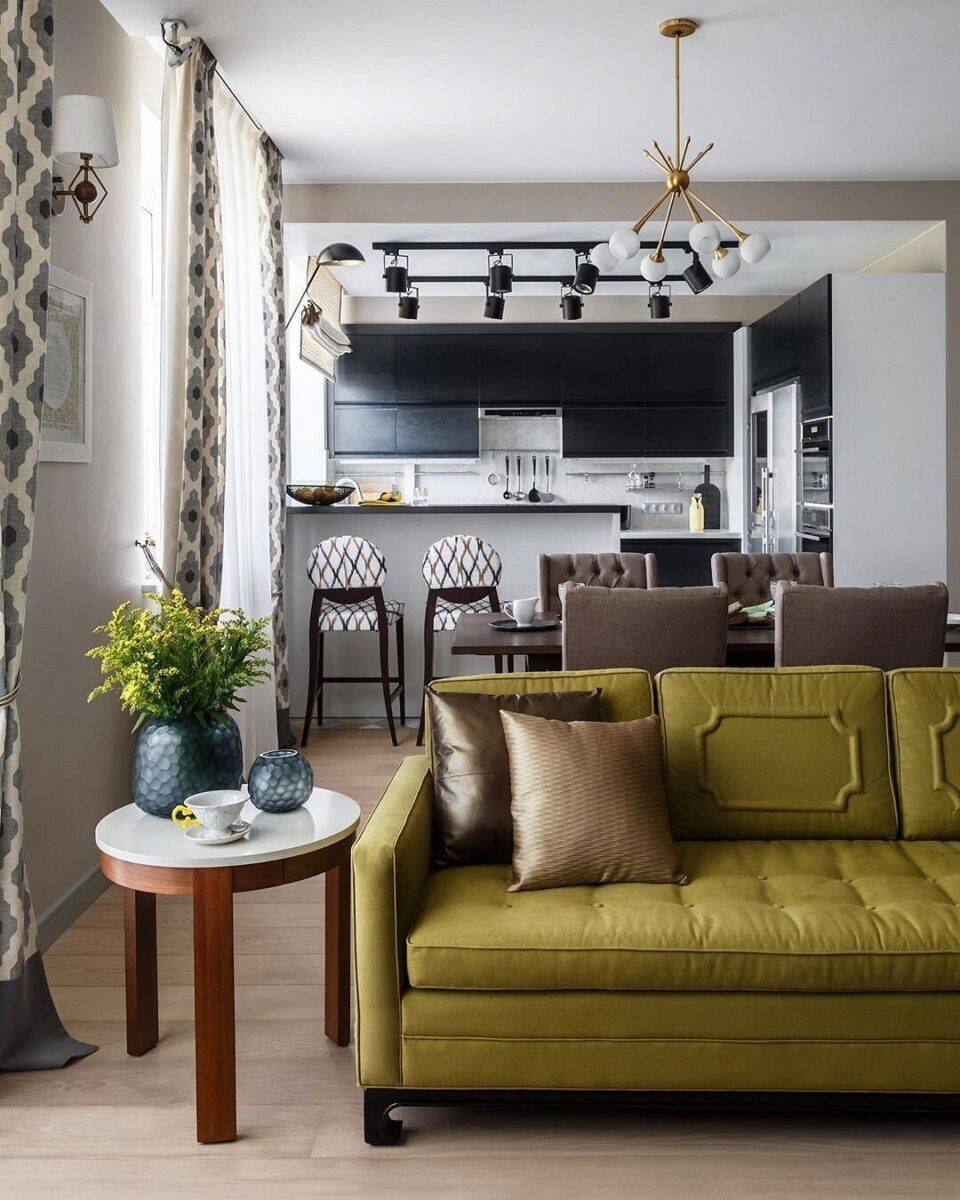 Особенность совмещенной гостиной с кухней диктует и необходимость в выборе дивана, а точнее материала для него. Желательно, чтобы обивка меньше впитывала запахи и легко поддавалась чистке. Съемный чехол сэкономит время, т.к. его можно стирать в машинке, и продлит срок службы мягкой мебели.