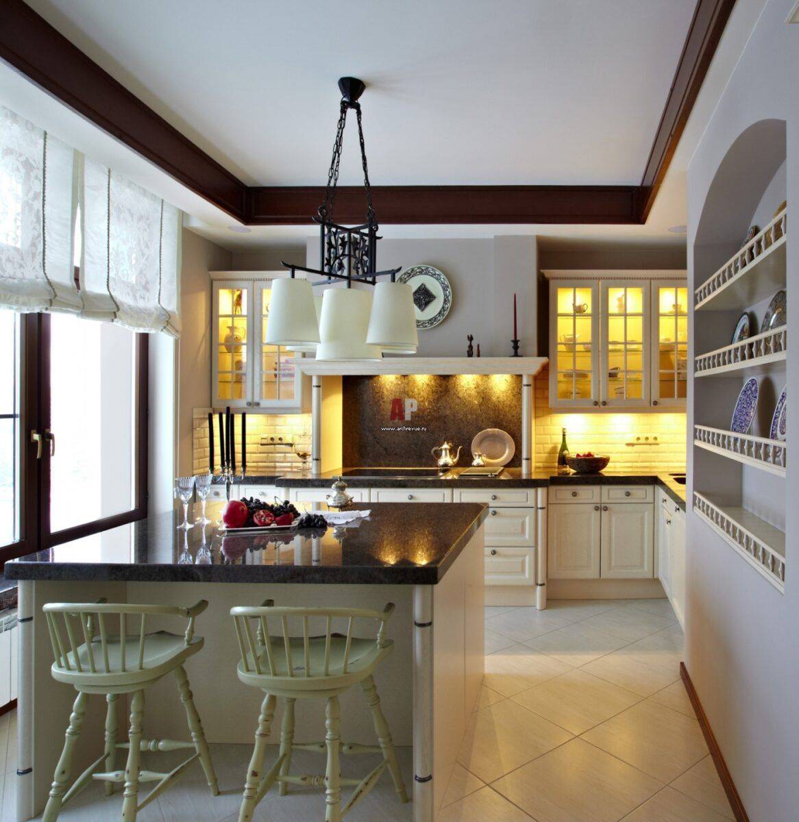 Дизайн кухни 25 кв.м. может сочетать в себе как точечные светильники, так и дополнительно размещение классических люстр и торшеров.