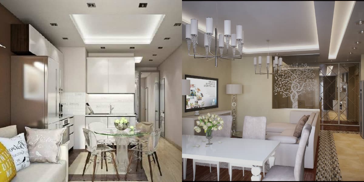 - разделение с помощью навесного потолка из гипсокартона. Создавая несколько навесных уровней полотка – можно намекнуть на разные зоны в комнате. Так, уголок кухни можно ограничить ярусами потолочных натяжек. Благодаря материалу – гипсокартону – возможна игра с формой навеса и ее подстройкой под дизайн.