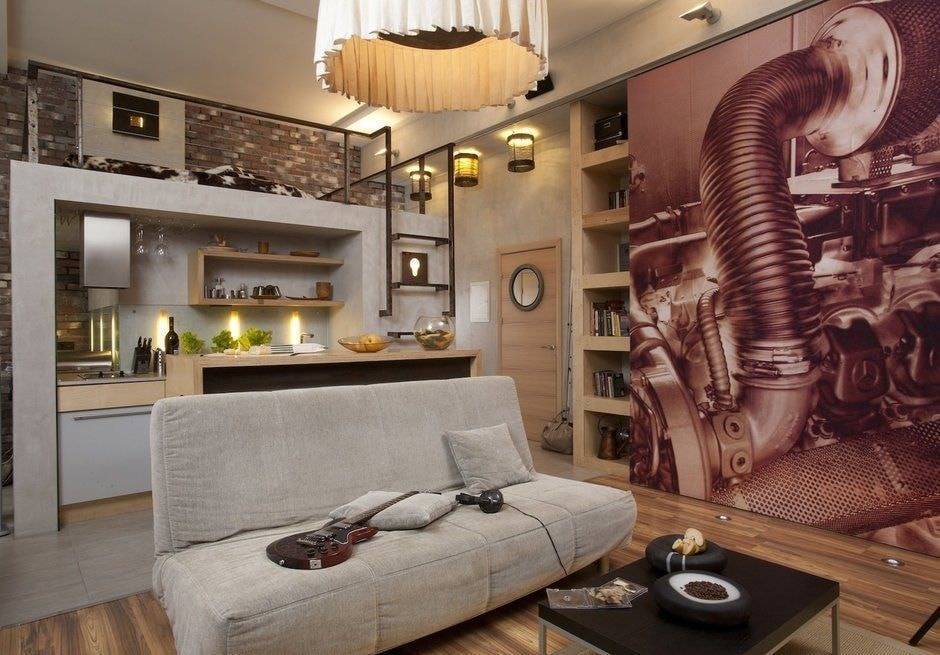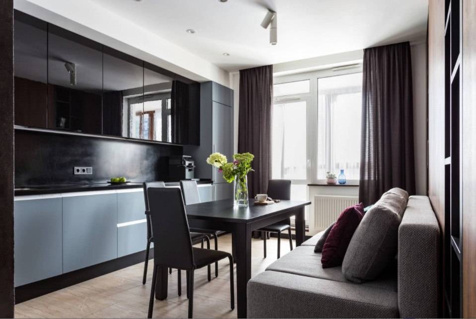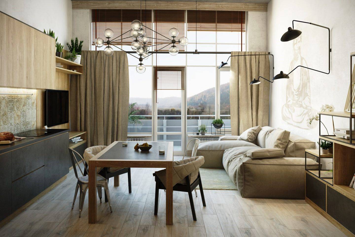 Гармоничная кухня-гостиная: студия 25 кв. м с визуальным разделением пространства