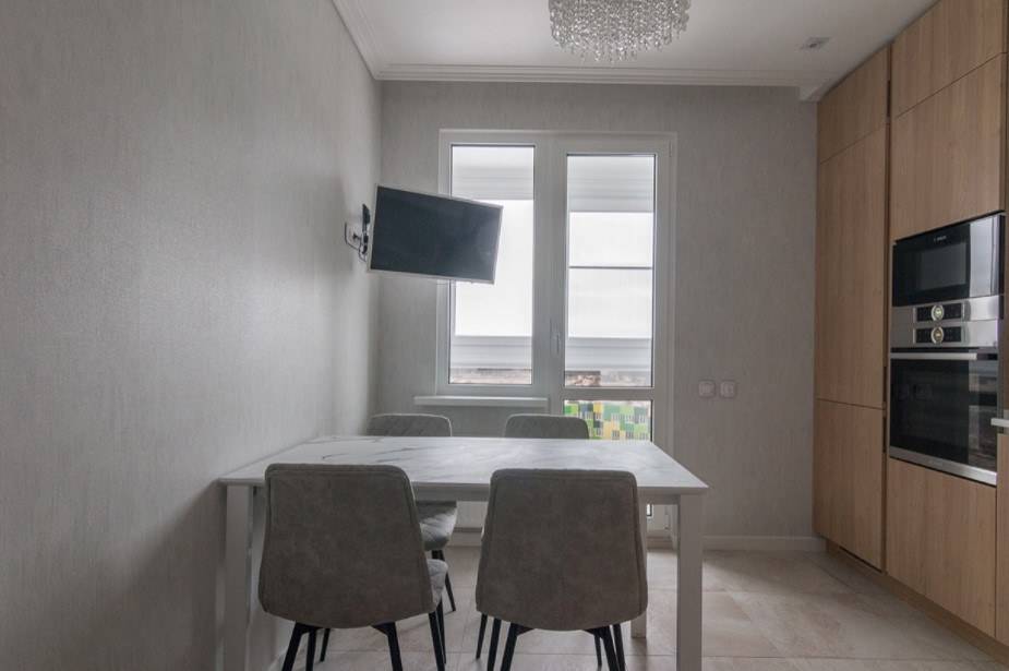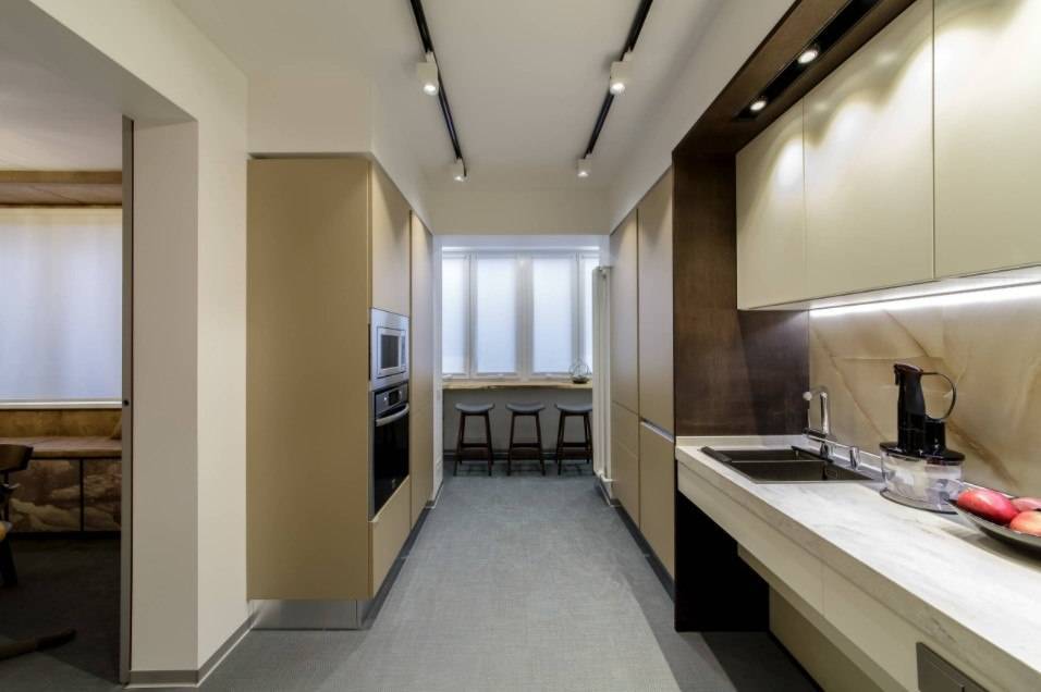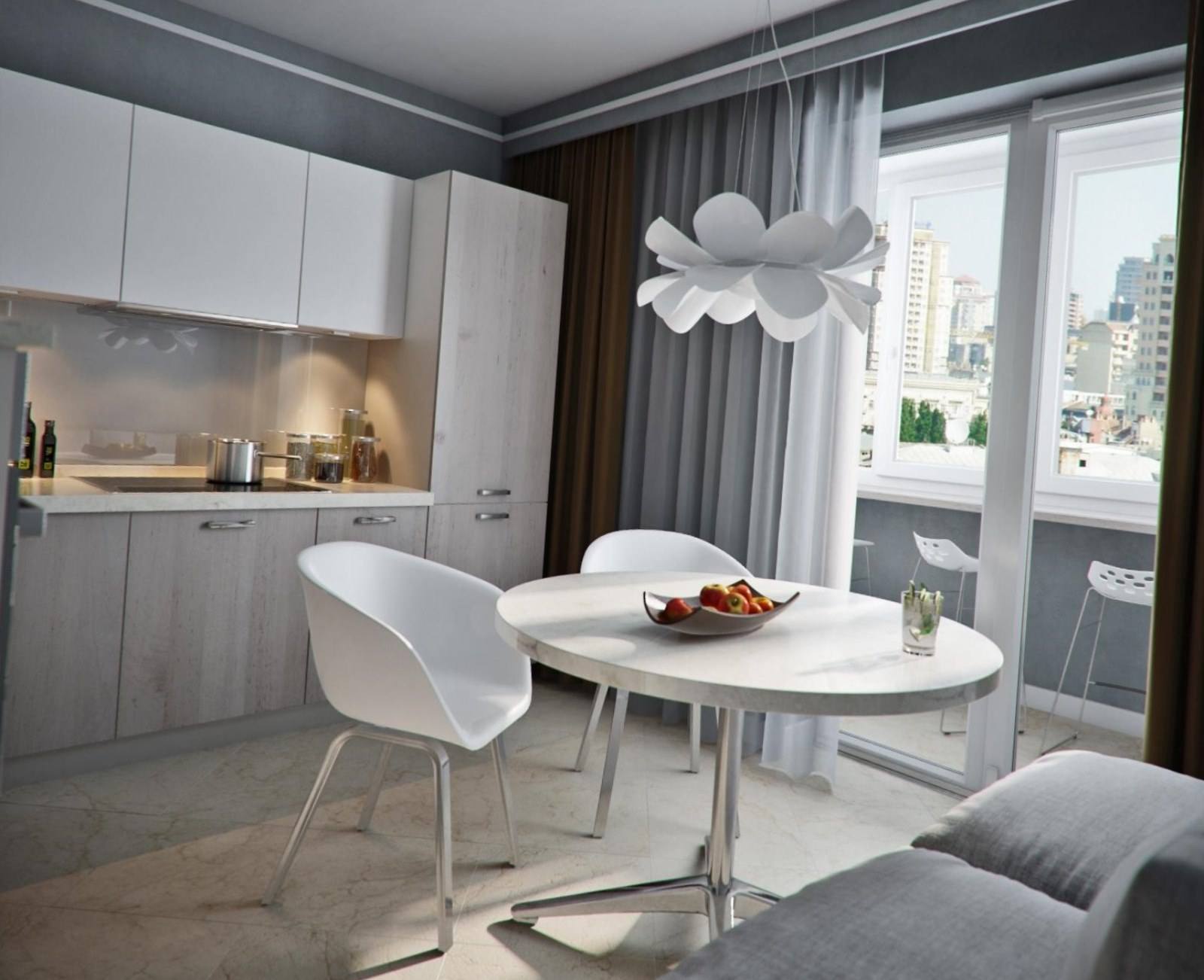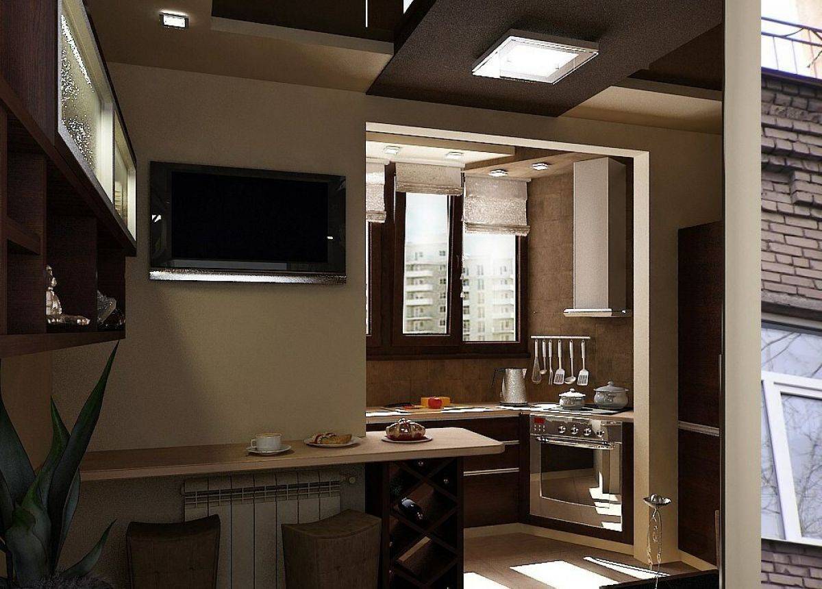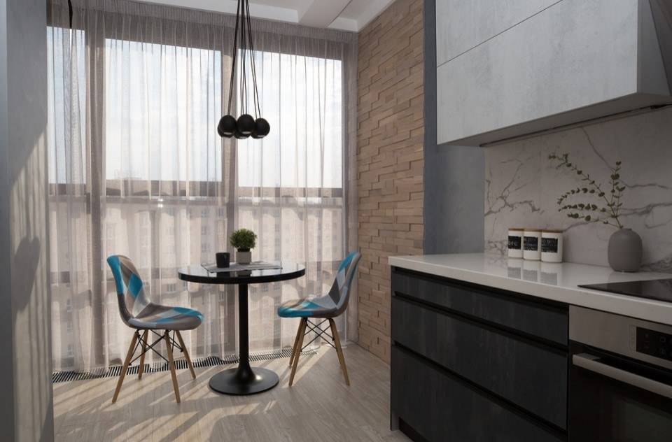 Дополнительное пространство балкона станет отличным местом для холодильника, а перегородка в виде стола или барной стойки прекрасно заменит объёмный обеденный стол и освободит пространство для уютного небольшого диванчика.