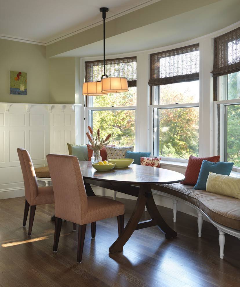 В эркере можно оборудовать обеденную зону, оснастив ее комфортным диваном