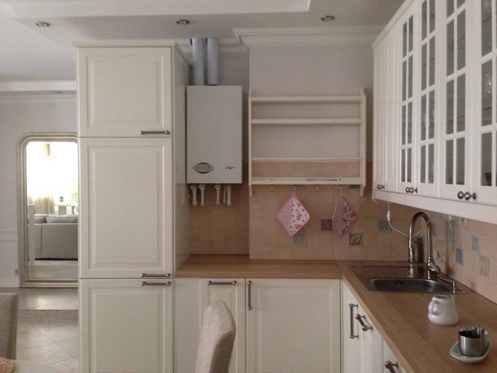 Чтобы короб, скрывающий газовое оборудование, не выделялся среди прочих, навесные шкафы кухонного гарнитура необходимо заказать под размер агрегата. Поэтому планировать классический дизайн необходимо после его установки.