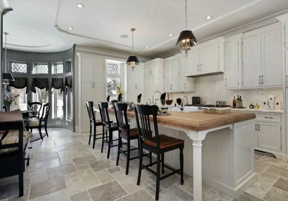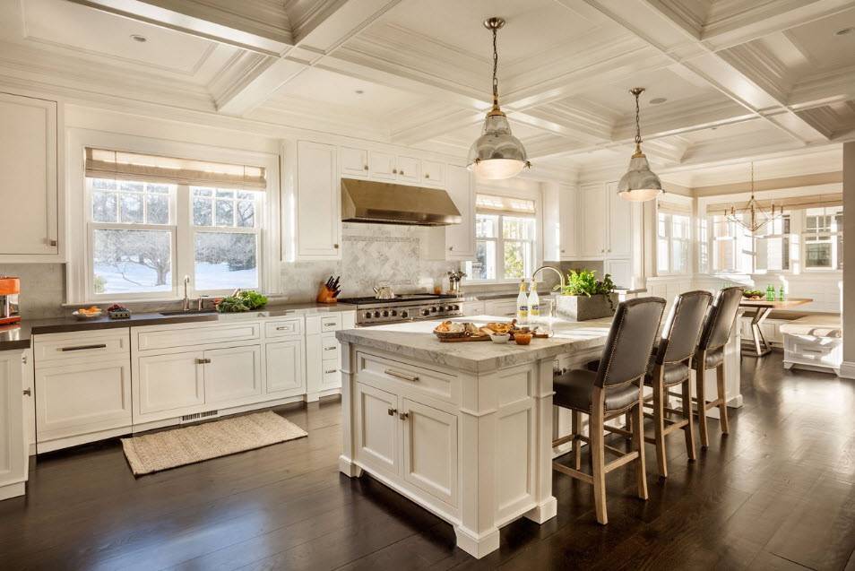Большие кухонные помещения можно разделить на несколько зон: обеденная зона со столом и стульями, зона для отдыха с мягкой мебелью, кладовая для хранения продовольственных запасов.
