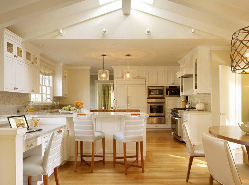 Стильно смотрится молочный или черно-белый интерьер в такой кухне. К основному светлому тону можно добавить несколько ярких акцентов. Как пример, красочные жалюзи или декорированная столешница.