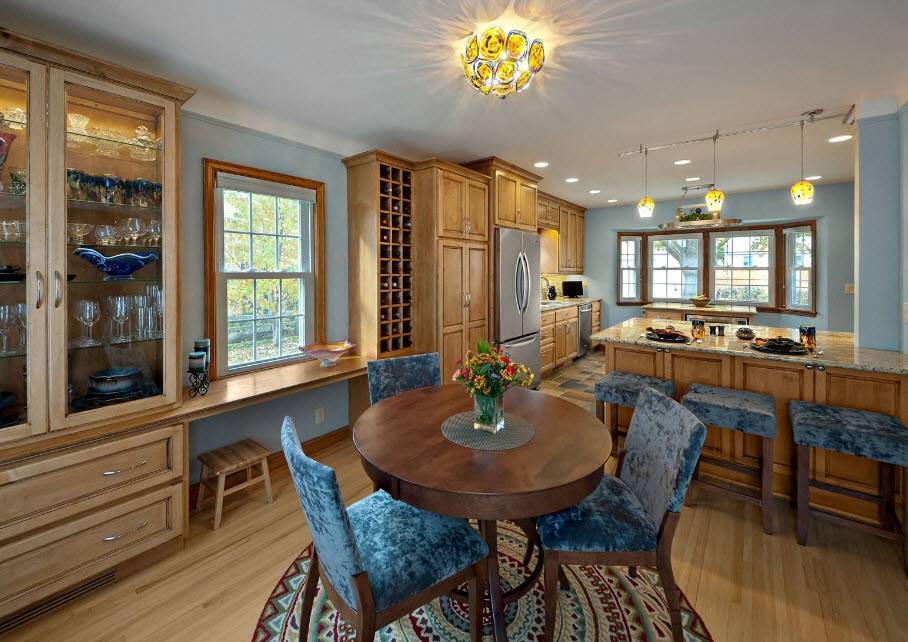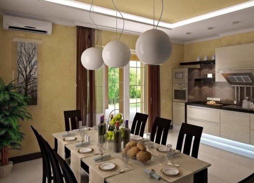 В столовой частного дома важно, чтобы здесь всегда было как можно больше света, желательно разнопланового. Здесь легко сочетаются между собой следующие источники света: