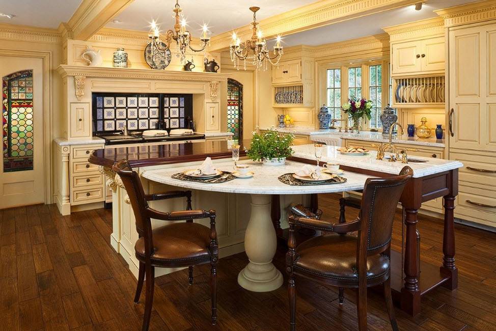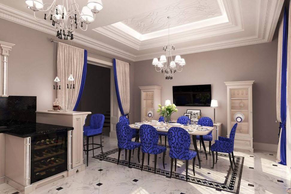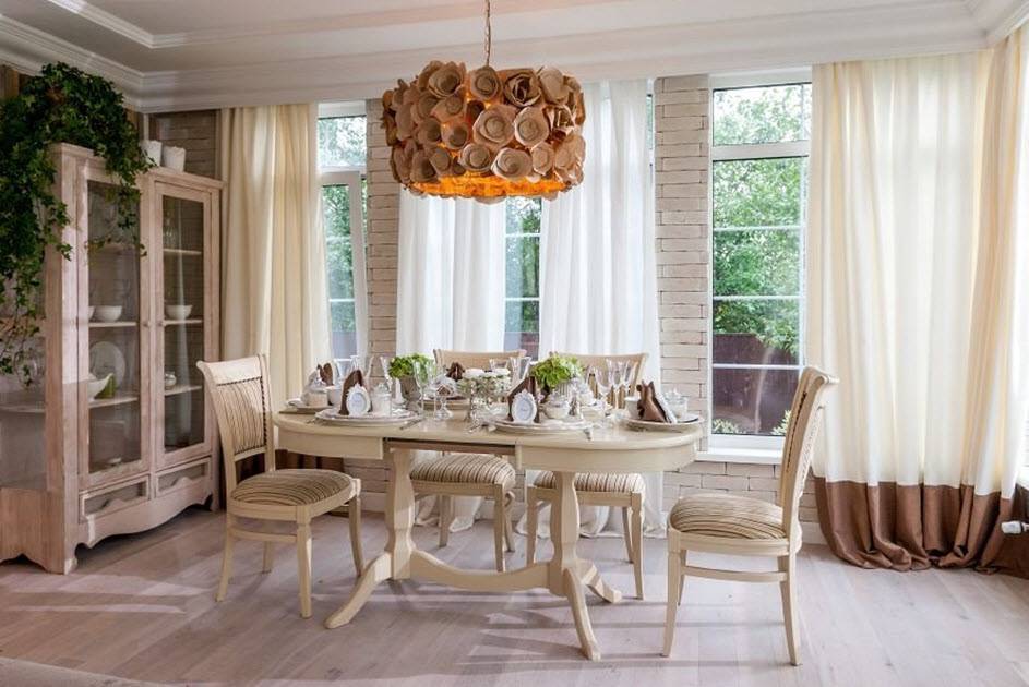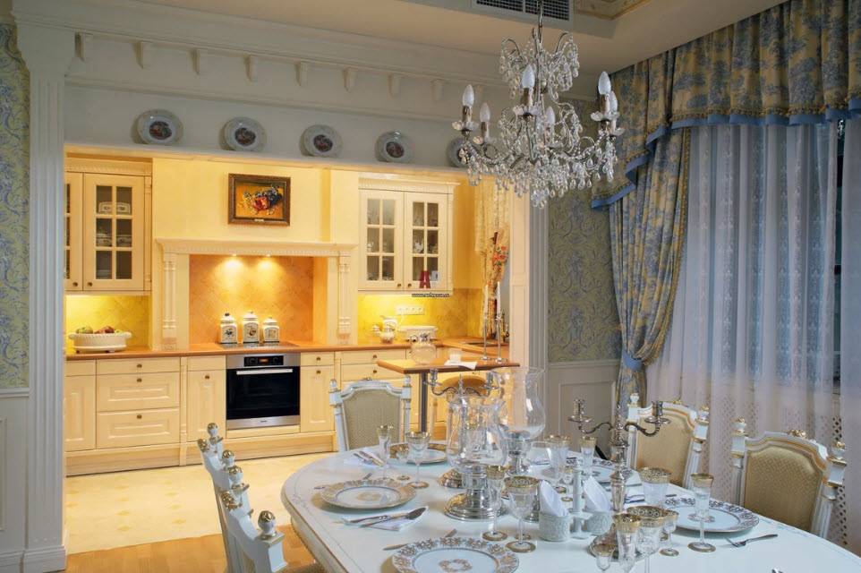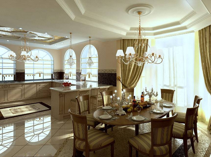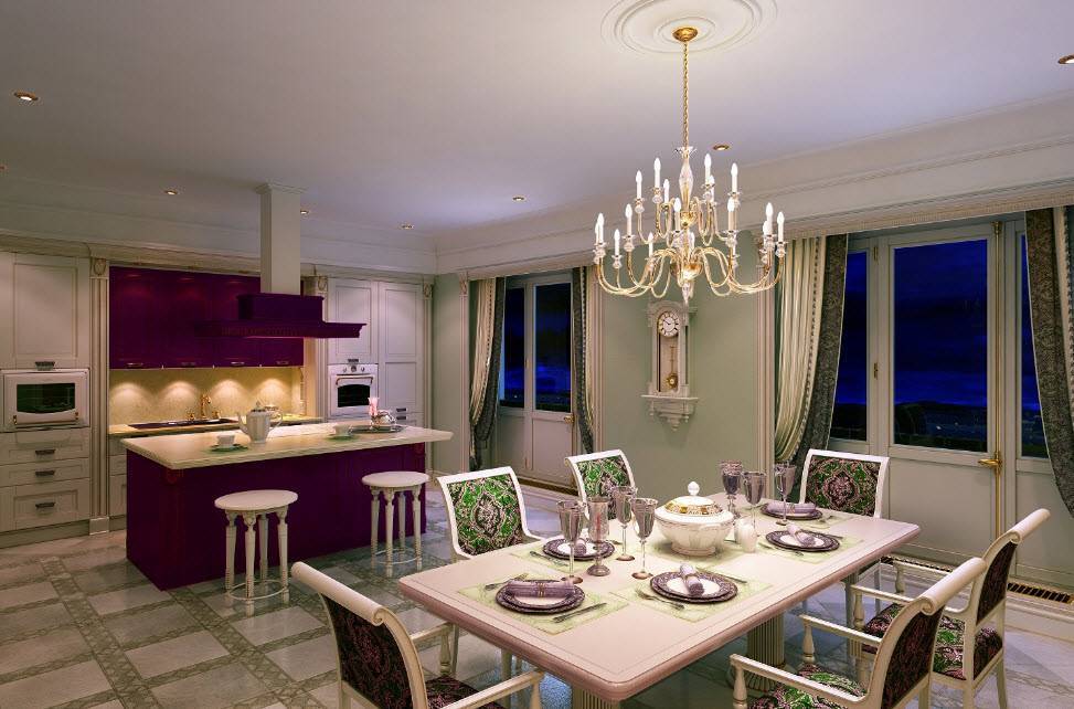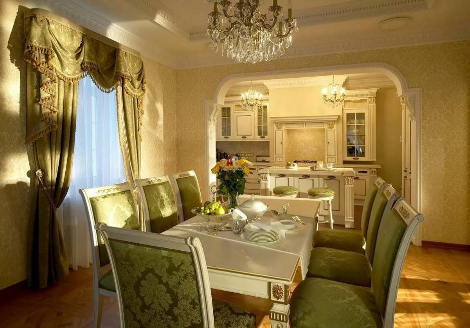 - Шикарная и большая люстра над столом (стеклянная, кованая или хрустальная).