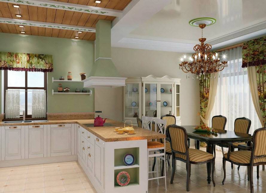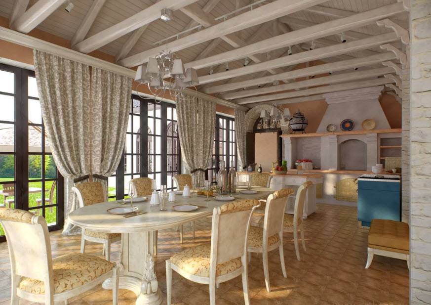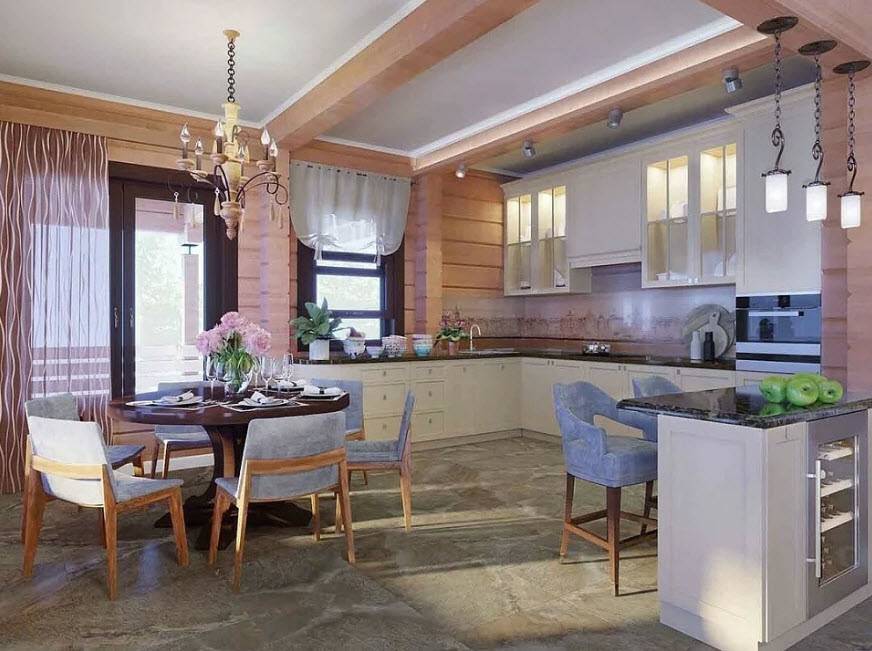 Рассмотрим вариант оформления кухни-столовой, расположенной в частном доме городского или загородного типа.