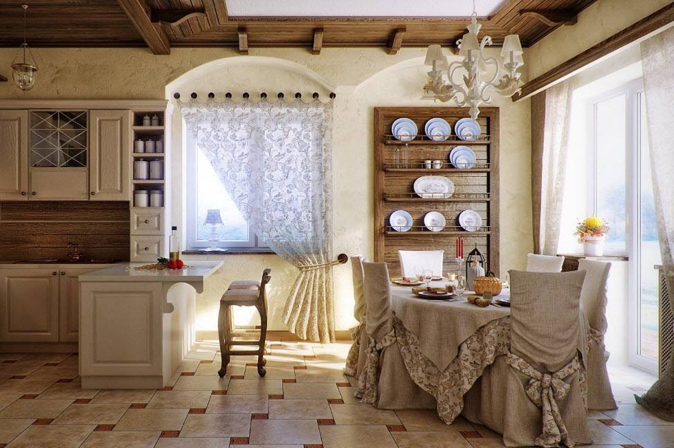 В отделке популярны дерево, камень, керамика. Хорошо впишется в дизайн плетёная мебель. Для текстильных элементов популярны лён, хлопок. В качестве декора можно расставить на подоконниках и полках живые растения в горшках или повесить на стены панно с композициями из сухоцветов.