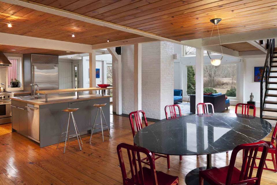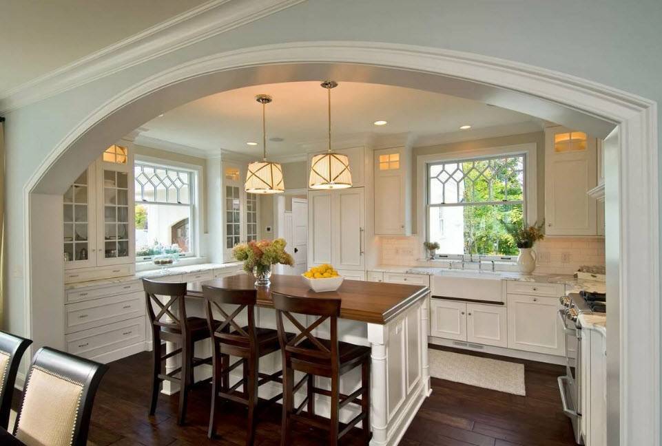 Главной движущей силой стала идея стереть границы между функциональными зонами в помещении. В начале прошлого века в доме хотели ликвидировать визуальную границу, отделяющую традиционно «женскую зону» от других помещений. Со временем задумка приобрела слегка иной смысл – визуальное расширение пространства. С практической точки зрения, демонтаж разделяющей 2 помещения стены – дело затратное, но результат того стоит.