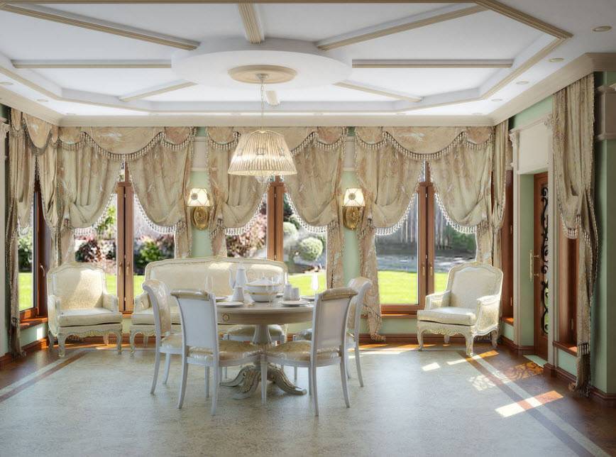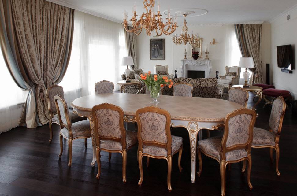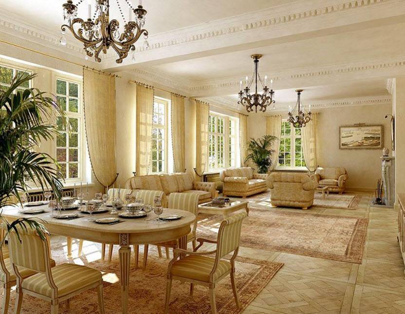Для декора стен подойдут обои с вензелями (например, стиль барокко). Гостиная будет смотреться очень изысканно, если отделать стены тканью. Стены могут дополняться имитацией колонн или лепниной. При отделке потолка лепнина, как правило, распределяется по периметру комнаты и в центре. Для пола используются дорогие материалы — натуральное дерево, паркет, мрамор. В гостиную-столовую частного дома, оформленной в классическом стиле, отлично впишется деревянная мебель с золочёными деталями.