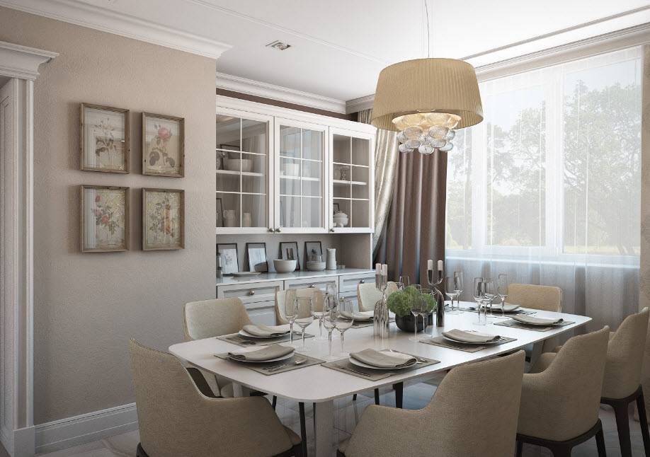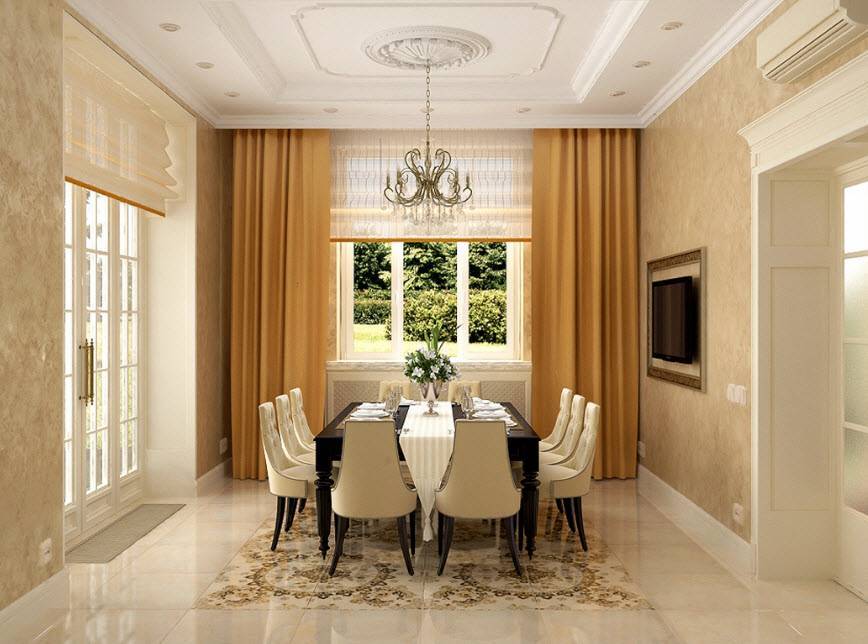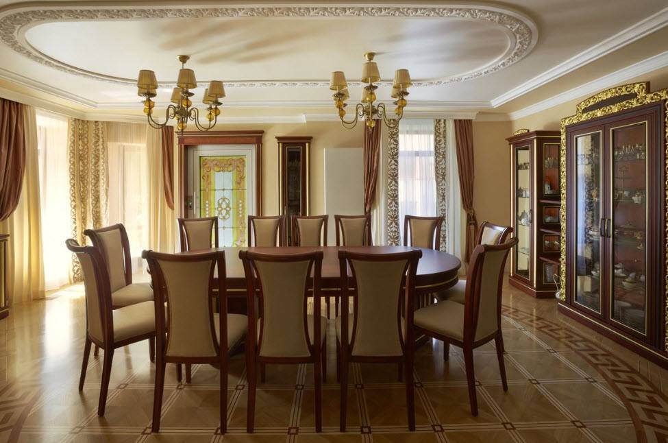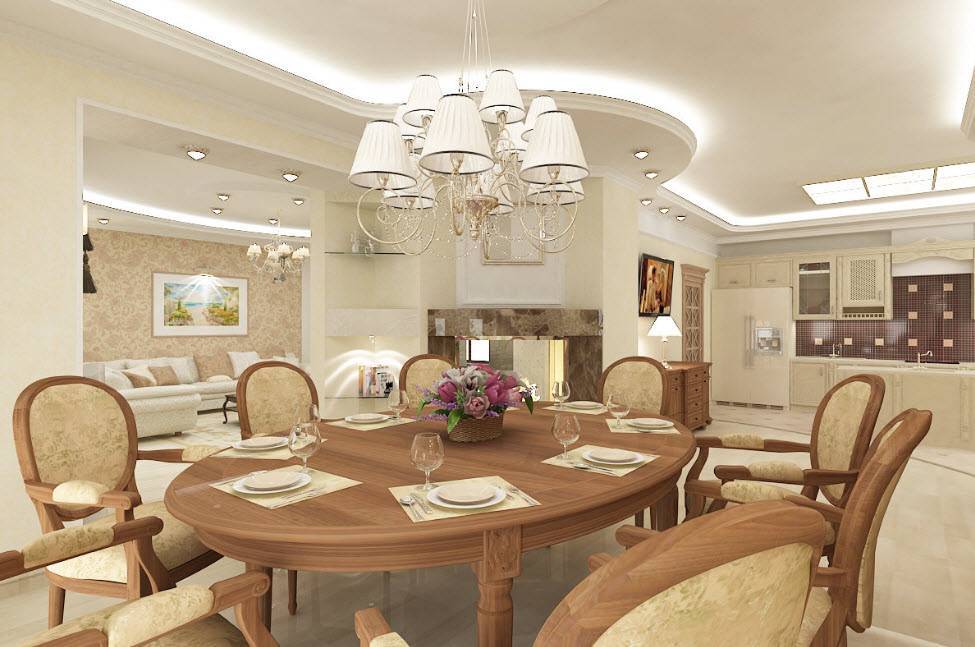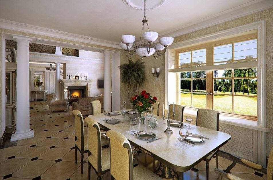 Классическая схема организации пространства в дизайне столовой в частном доме.