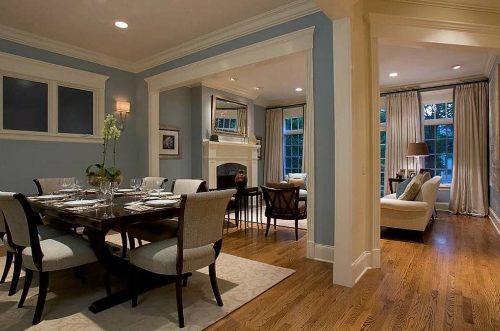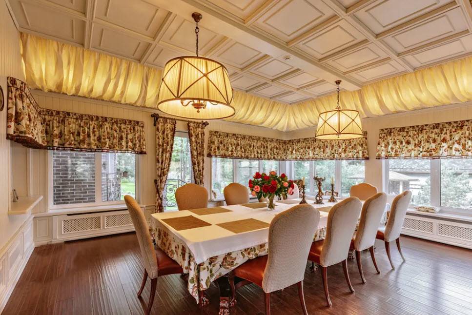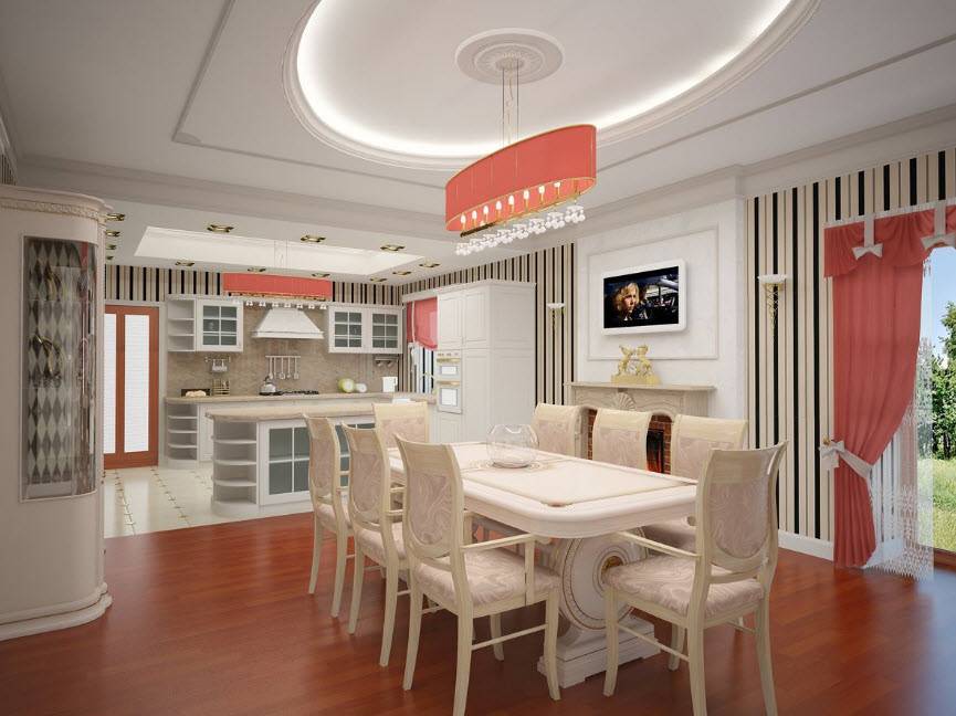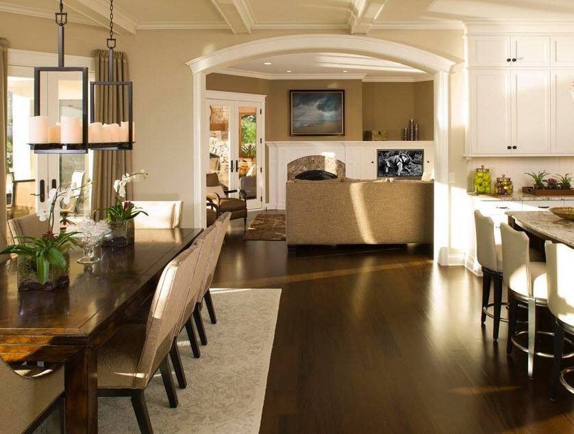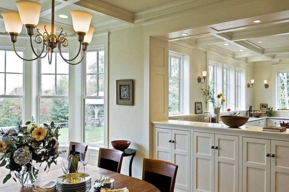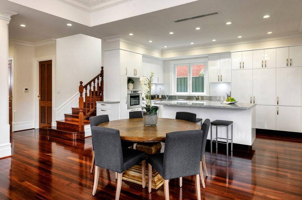 Классическая схема организации пространства в дизайне столовой в частном доме.