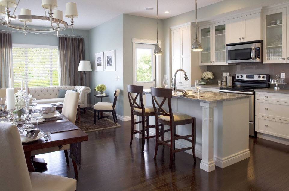 Поделит пространство и перепад уровня пола, разная расцветка стен или освещение. Например, в кухне пол из плитки, а в столовой – ламинат. Или в кухне яркий свет, а в гостиной – мягкий приглушенный.