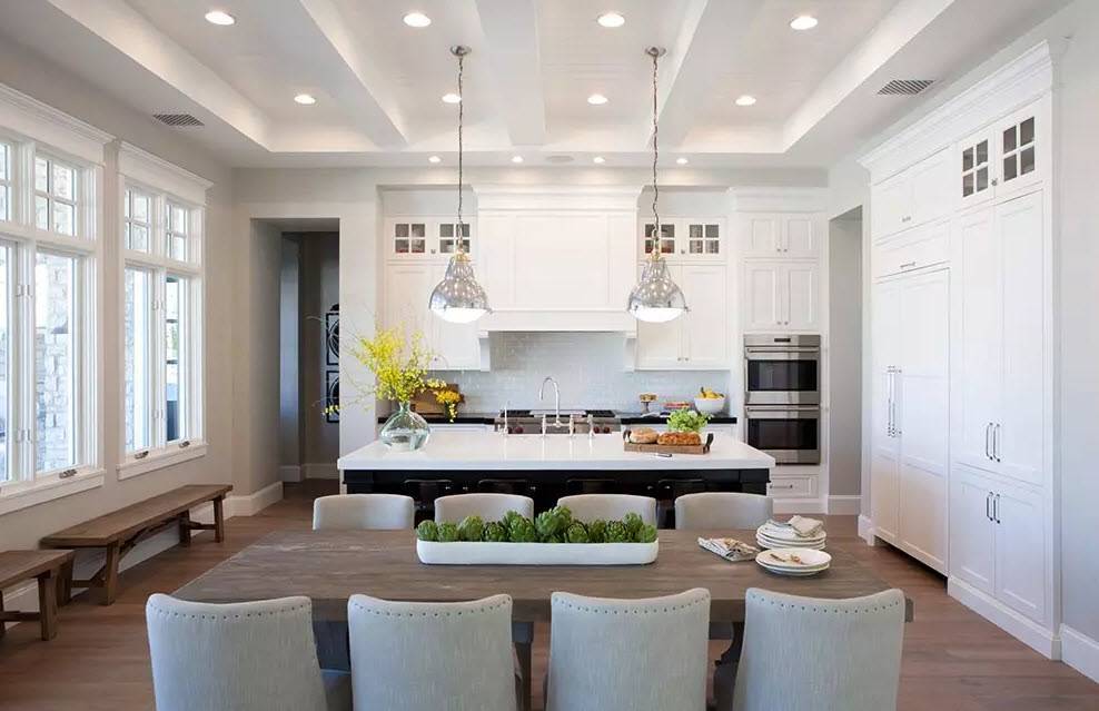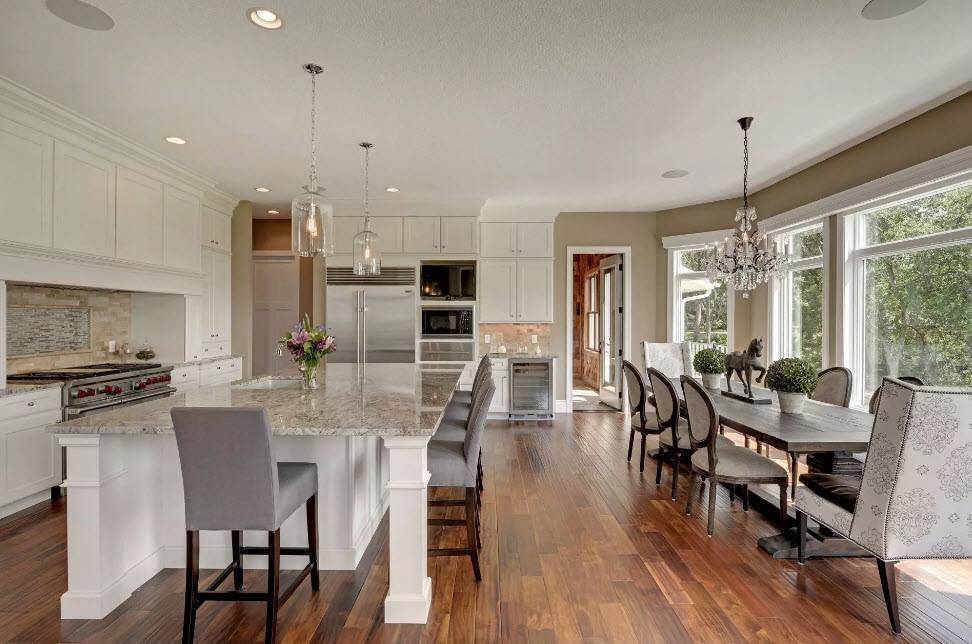 Чтобы визуально расширить интерьер кухни-гостиной в собственном доме, важно учитывать, как будет выглядеть объединенная столовая. Все элементы дизайна должны быть оформлены в одном стиле