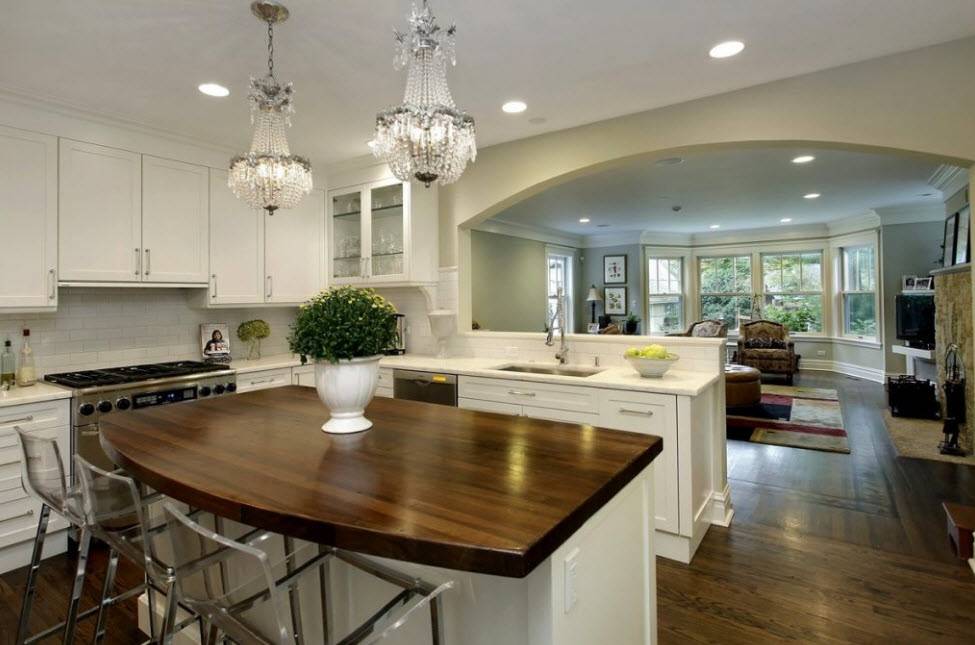 Прекрасно вписывается в окружающее пространство и зонирует помещение – барная стойка. При наличии широкой столешницы, она может заменить обеденный стол. Также с разделением комнаты отлично справится функциональный остров с варочной панелью или мойкой.