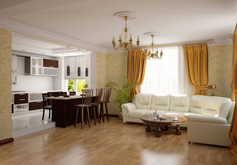 - Расширение площади гостиной за счет кухни.