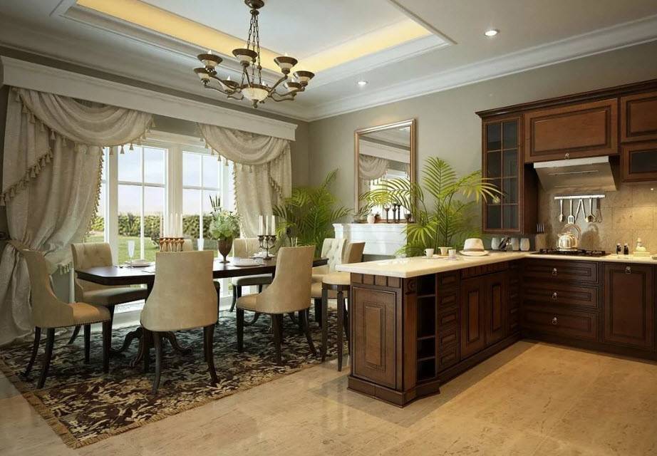 Считается, что наиболее подходящим стилем для оформления гостиной, совмещенной с кухней, является неоклассика. Во время выбора стоит ориентироваться на интерьер других комнат в квартире.