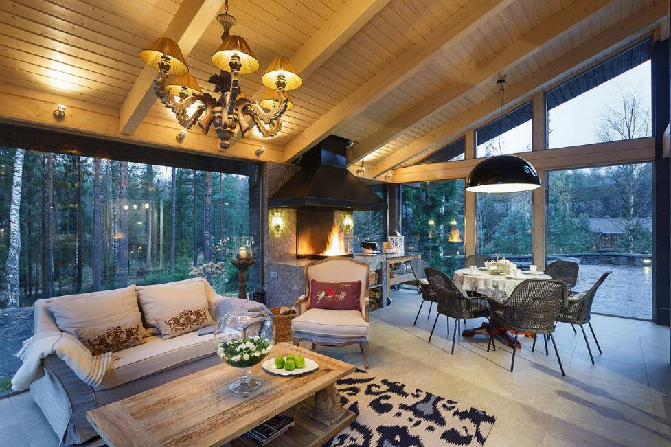 Если интерьер совмещенного пространства в загородном доме гармоничен, то от этого поднимается настроение, появляется желание приглашать в гости друзей, повышается аппетит.