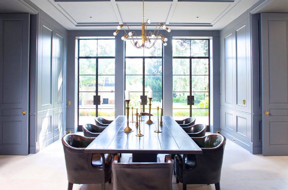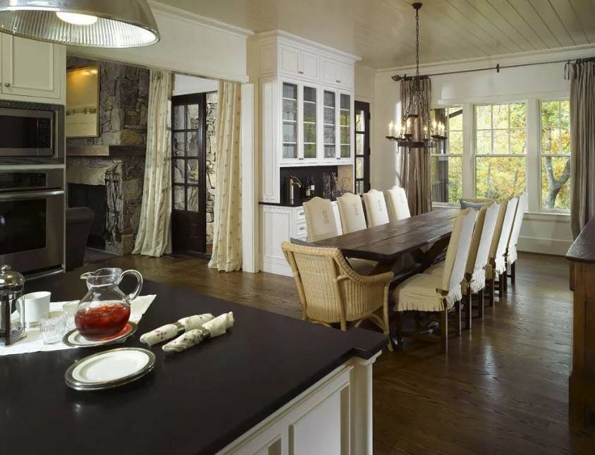 Столовая, которая служила бы отдельным помещением, предназначенным исключительно для трапезы, была атрибутом аристократических особняков в 15-18 веке. Даже сейчас в ряде европейских государств на кухню отводят всего несколько квадратных метров, а вот столовая служит особой территорией, которую никто не ущемляет в правах. Владельцы частного дома скорее пожертвуют гостиной или спальной, чем откажут себе в удовольствии обедать за большим столом, принимать гостей и родственников в отдельной и большой комнате. Среди нашей элиты такое решение также популярно, ведь считается, что отдельная столовая – это признак хорошего тона.