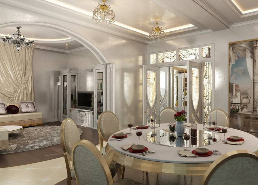 Один из самых роскошных стилей. Само направление зародилось в начале 20 века при попытках сочетать аристократизм и последние новинки в технике. Зал и кухня в стиле ар-деко роскошны, при этом вычурность отделки нисколько не мешает функциональности.