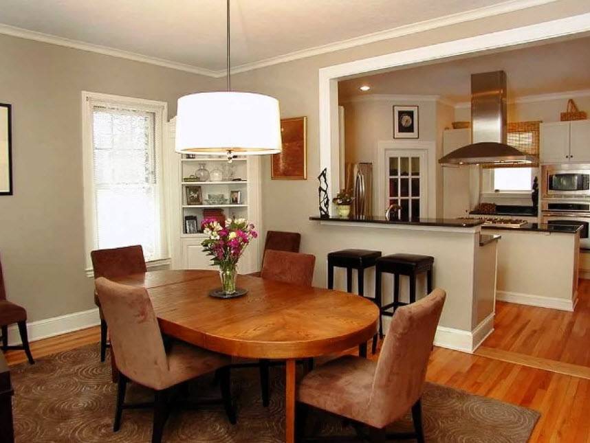 Если дом спроектирован так, что небольшая кухня соседствует с гостиной, столовой или прихожей, то эти комнаты можно объединить.