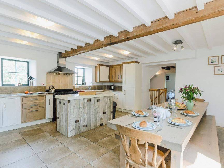 Интерьер кухни в частном доме планируется исходя из стиля остальных помещений. Если гостиная и спальни выполнены в неоклассике, проектируйте дизайн кухни в том же направлении. Хай-тек можно совмещать с техно-стилем и любым индустриальным стилем (конструктивизмом, лофт). Скандинавский по сути является ответвлением эко-стиля. Прованс и кантри – родственные друг другу направления дизайна. Материалы для отделки применяются такие же, как в остальных комнатах, так сохраняется единство дизайна.