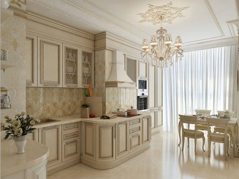 Классический стиль чаще всего оформляется с содержанием в интерьере бежевых деталей, поэтому в нем бежевая кухня является наиболее гармоничным решением. Помимо этого такой дизайн обязательно содержит элементы древесины, массивную мебель, тяжелые шторы, дорогую плитку.