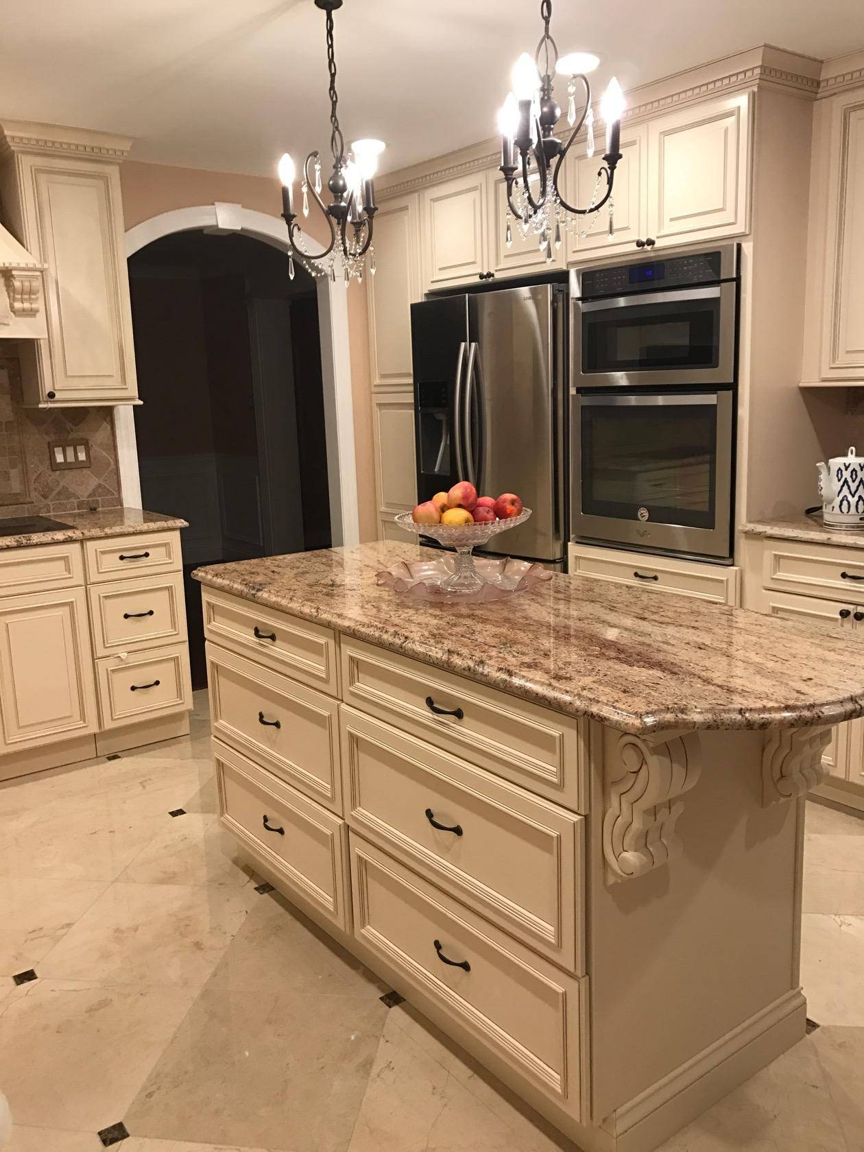 В большом помещении можно дополнить гарнитур островом, барной стойкой или обеденным столом в едином стиле.