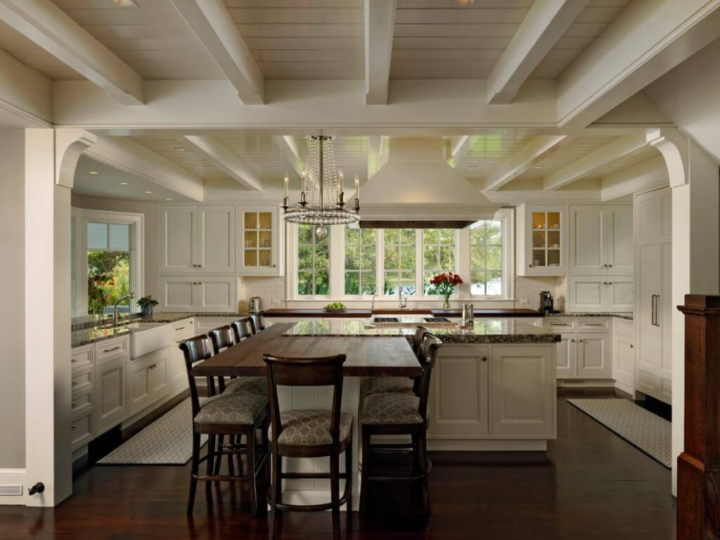 Большие кухонные помещения можно разделить на несколько зон: обеденная зона со столом и стульями, зона для отдыха с мягкой мебелью, кладовая для хранения продовольственных запасов.