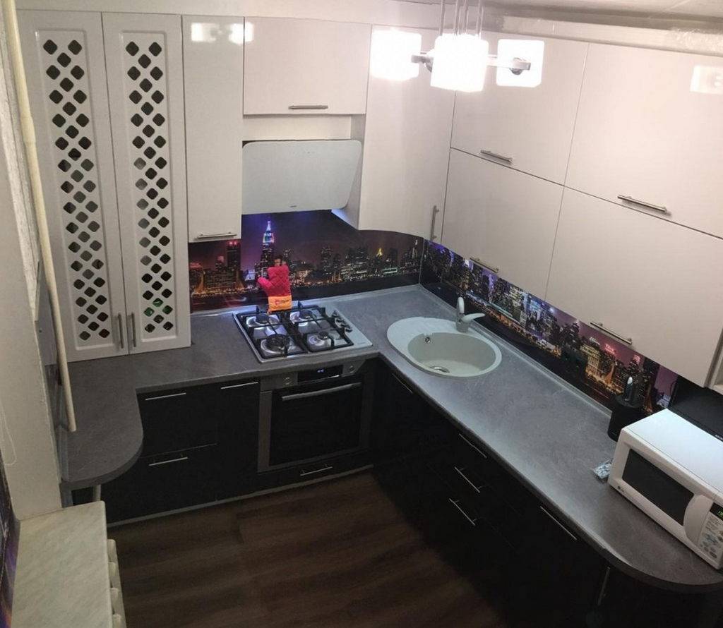 Отличным вариантом станет выбор лаконичного гарнитура с верхними фасадами белого цвета, и черным цветом нижних фасадов. Предпочтение следует отдавать блестящим гладким текстурам, которые визуально увеличивают пространство и отражают поверхности.