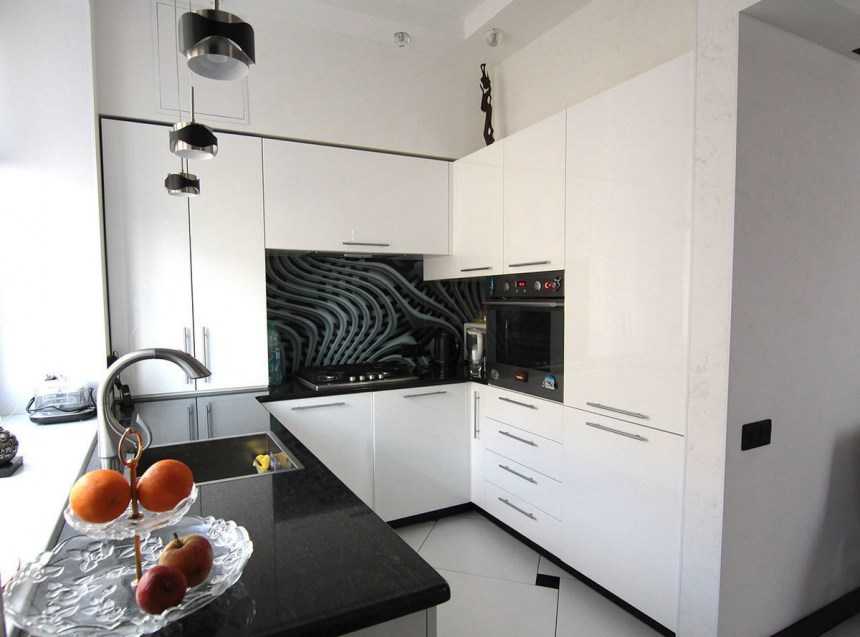 Черная столешница с белыми фасадами смотрится очень эффектно