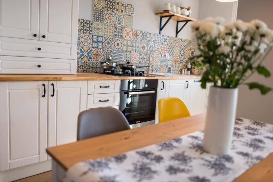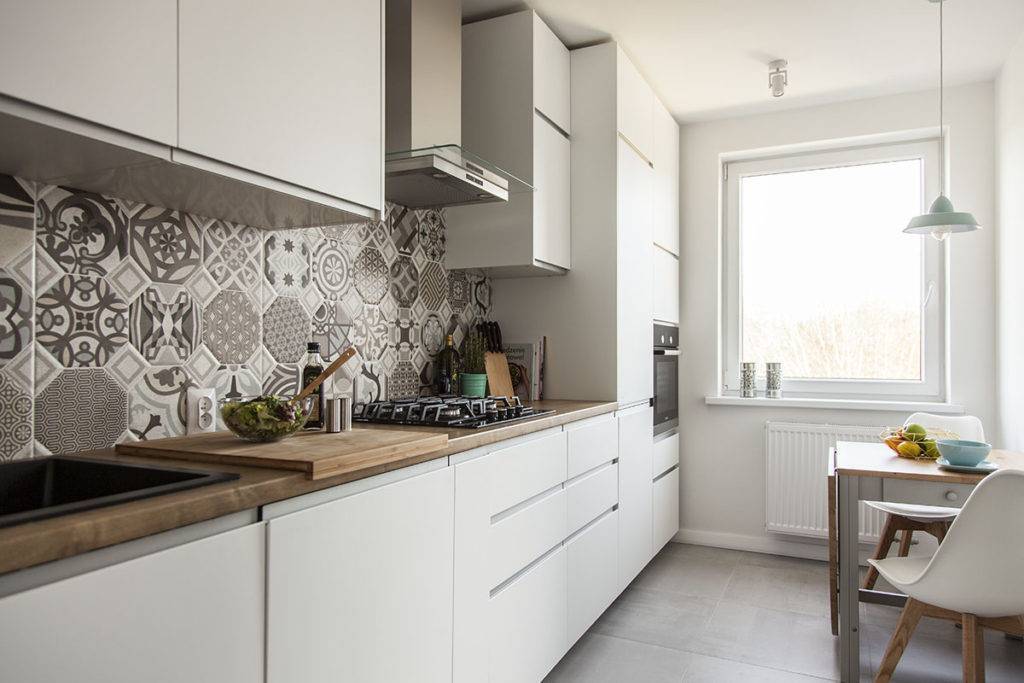 Белая кухня еще не полностью исчерпала возможности выбора цвета. Хотя в небольших комнатах стоит выбирать яркие цвета, мы найдем целую палитру цветов, которая обеспечит интересные визуальные эффекты. Светлая комната может иметь контрастные мебельные фасады, плитку или декоративное стекло над рабочей поверхностью.
